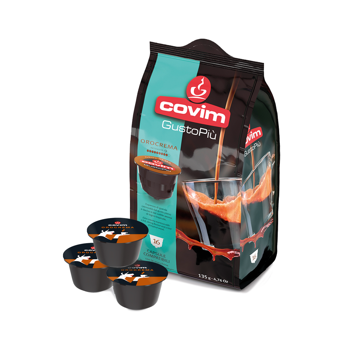1 Confezione da 96 (6x16pz) capsule monodose compatibili con il sistema Nescafè® Dolce Gusto®*. La mia miscela Orocrema, un connubio vigoroso di arabica e robusta con un sottile aroma di legno tropicale. Per un caffé dall’intensità decisa.